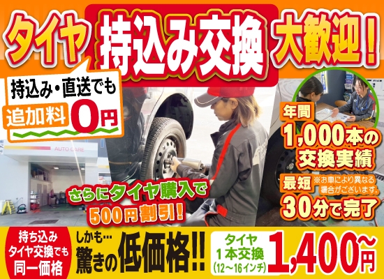 最近はネットで購入した格安タイヤやスタッドレスタイヤへの交換ニーズもあり、より便利なカーケアショップを目指して、タイヤ交換のみも大歓迎です。